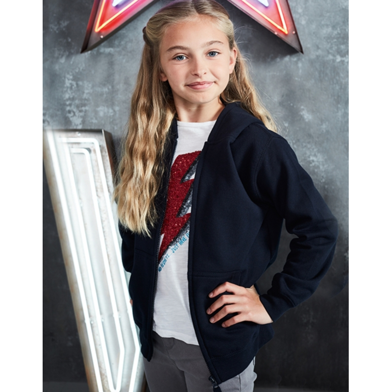 Sweat-shirt à capuche avec zip frontal sur toute la longueur. Doubles surpiqûres. Capuche doublée à l'intérieur et tirette en sergé de couleur assortie. Poche kangourou, poignets en côte 1x1, pas de cordon de serrage pour la capuche conformément au règlement européen. Production certifiée WRAP. Étiquette détachable idéale pour une personnalisation facile.