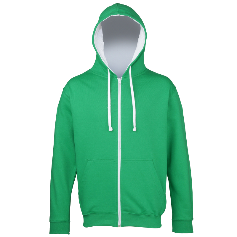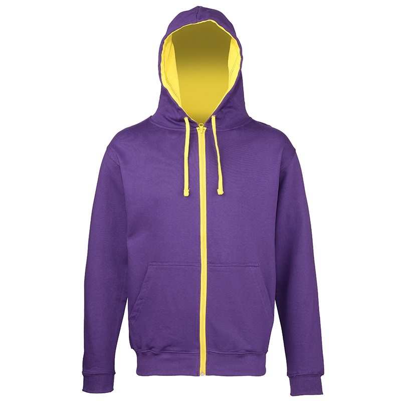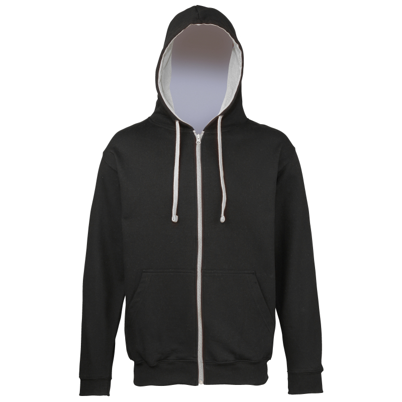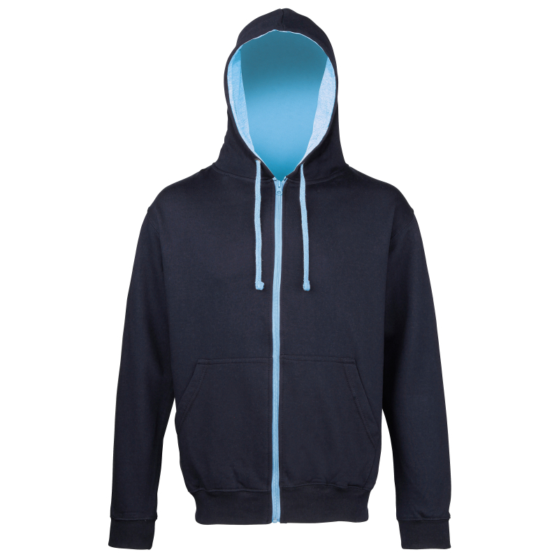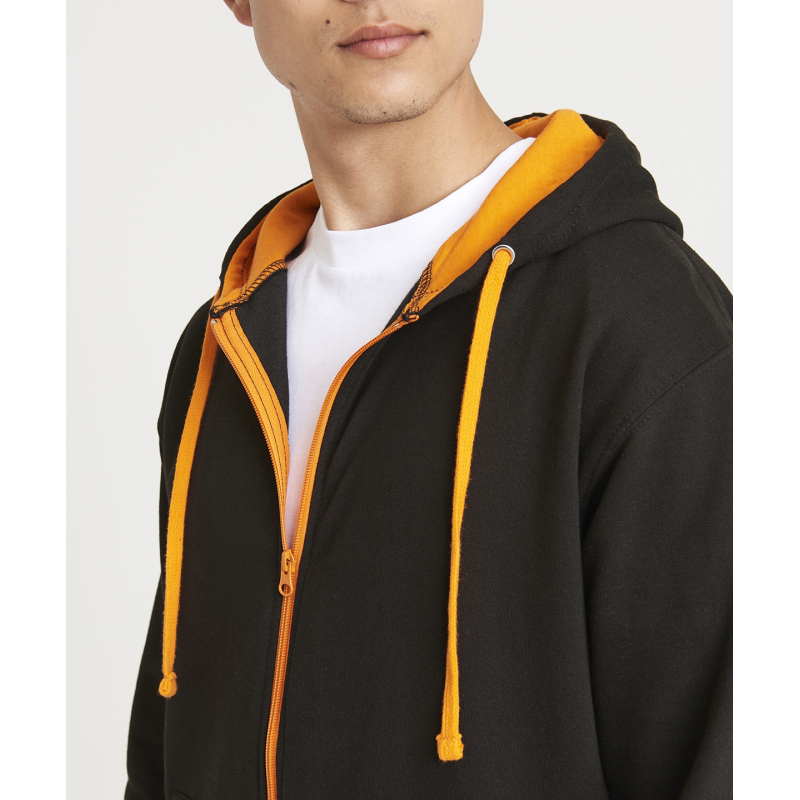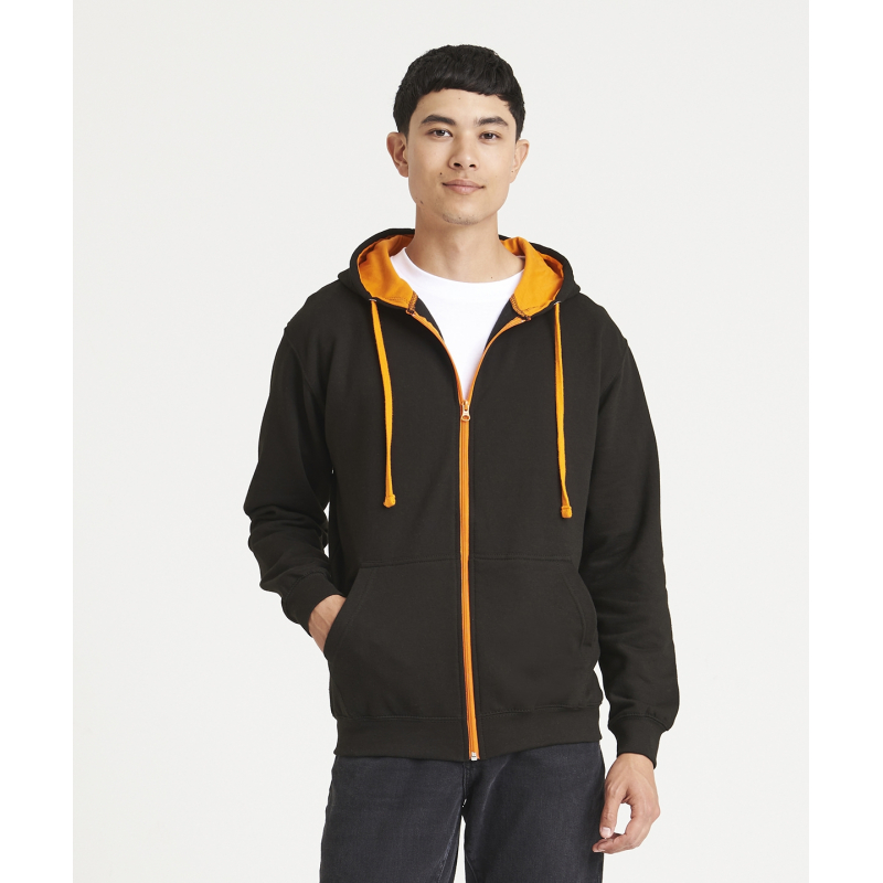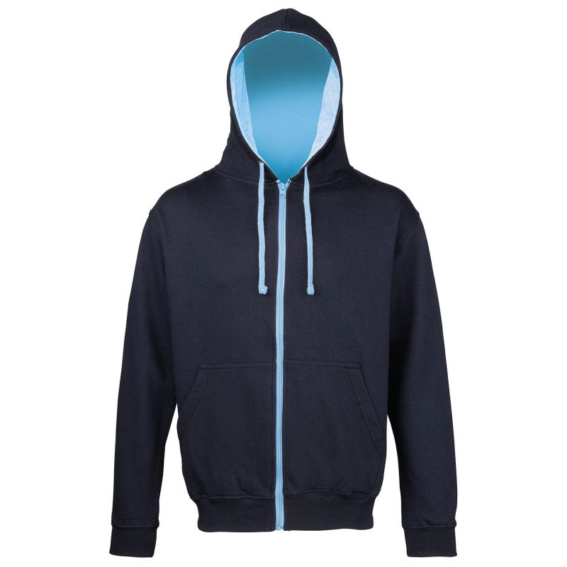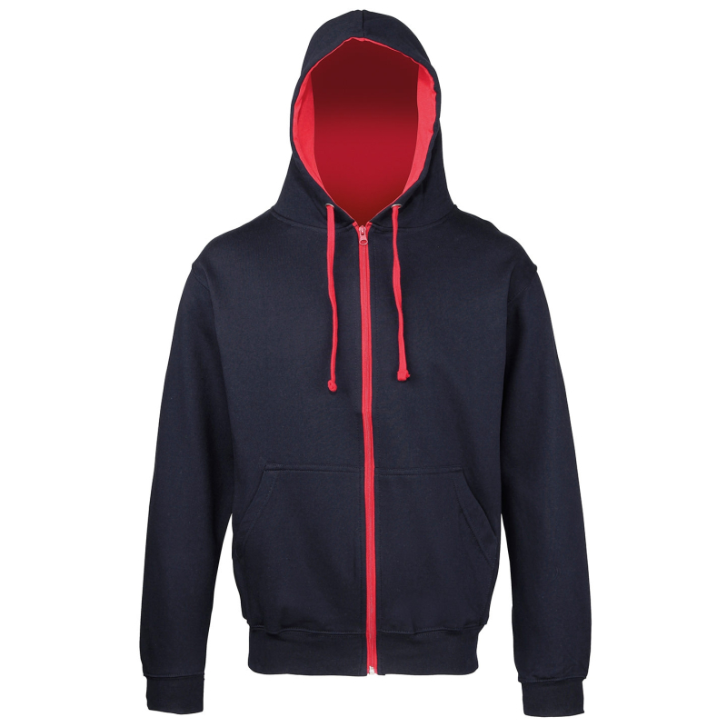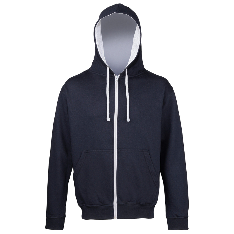 Sweat-shirt zippé Varsity AWDis JH053. Sweat à capuche à double épaisseur de tissu avec doublure contrastée et zip intégral en plastique contrasté.