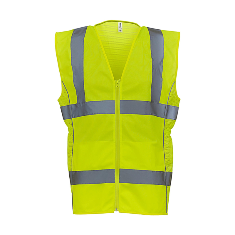 Poids : 100-120 g/m² - Composition : 100% polyester - Fermeture à glissière ton sur ton - Dos en maille respirante - Taille partiellement élastique - Bandes réfléchissantes des deux côtés avec poche latérale cachée.