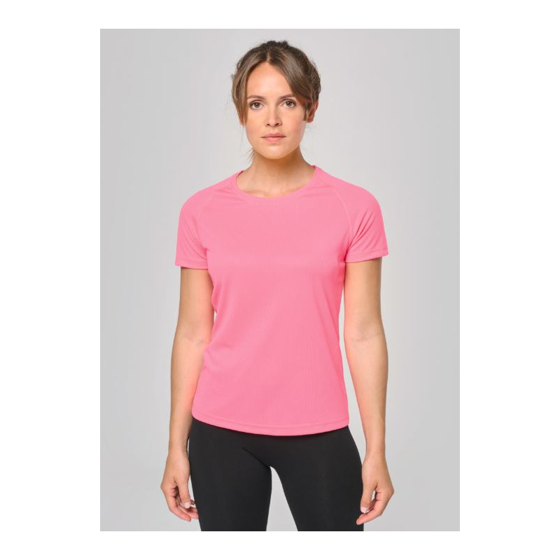 100% polyester. Tissu léger à séchage rapide. Encolure ronde avec bande de propreté. Manches raglan avec points de recouvrement. Finition double aiguille à l'encolure, bas de manches et de vêtement.