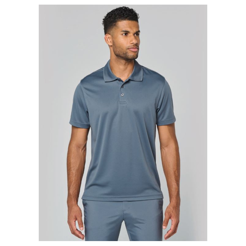 100% polyester interlock. Tissu à séchage rapide. Col en bord-côte. Patte de boutonnage 3 boutons. Bande de propreté contrastée encolure et fentes côtés. Passepoil contrasté épaules. Finition double aiguille bas de manches et bas de vêtement.