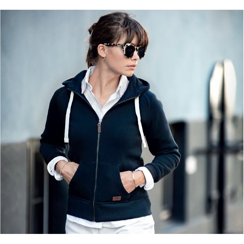 Sweat-shirt capuche zippé pour Femme de haute qualité en 310 g/m² avec détails en cuir comme la tirette de zip et cordons plats larges