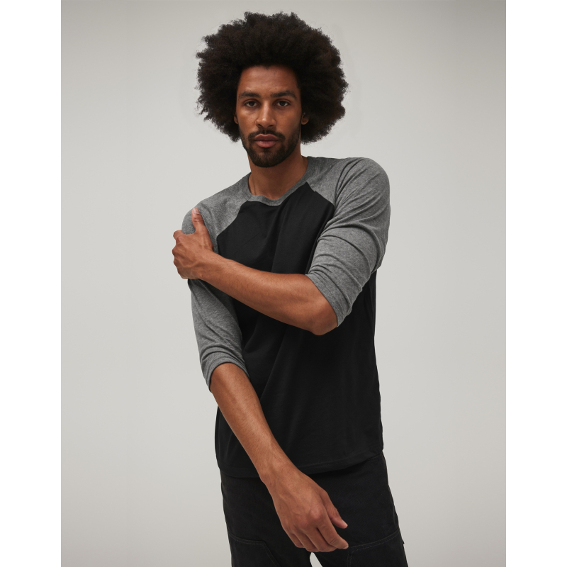 Poids : 122 g/m² couleurs triblend: 128 g/m² | Solid/Neon colors: 52% coton peigné ringspun, 48% polyester | 50% polyester, 25% coton peigné ringspun, 25% viscose | bord côte à l encolure contrasté | manches 3/4 raglan contrastées | coutures latérales | modèle étroit