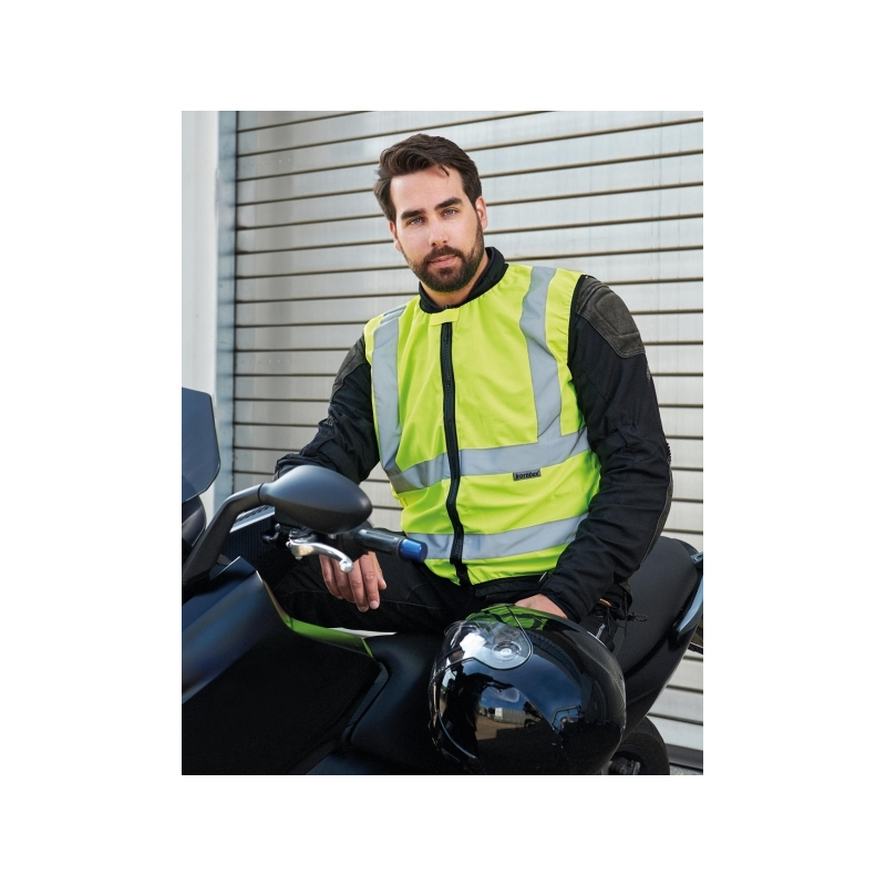 Ce gilet de sécurité spécialement adapté pour les 2-roues dispose d'une fermeture qui ne s'ouvre pas en cas de vent ainsi qu'un élastique à l'intérieur du gilet pour réduire le flottement à grande vitesse. Les bandes réfléchissantes son homologuées EN ISO et garanties jusqu'à 25 lavages.