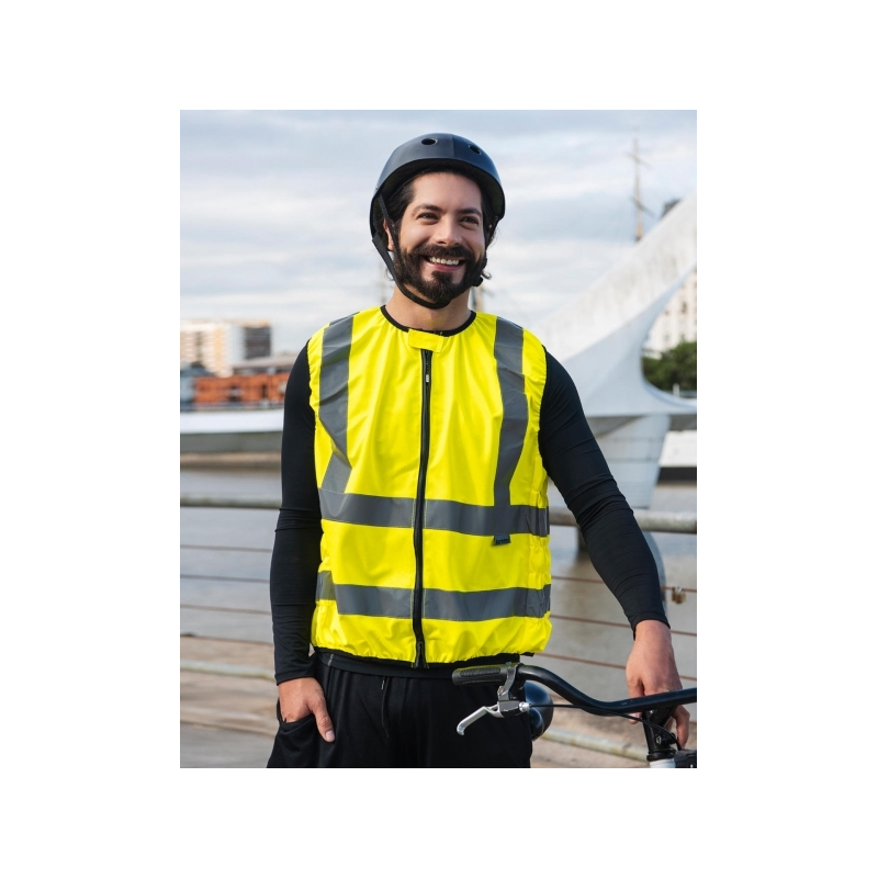 100% polyester | Zip intégral avec fermeture auto-agrippante garantissant que la fermeture ne s'ouvre pas en cas de vent | Élastique à l'intérieur du gilet pour un ajustement optimal et réduisant le flottement à grande vitesse | Bandes réfléchissantes verticales et horizontales (largeur 5 cm) devant et derrière EN ISO 20471:2013/A1:2016 |