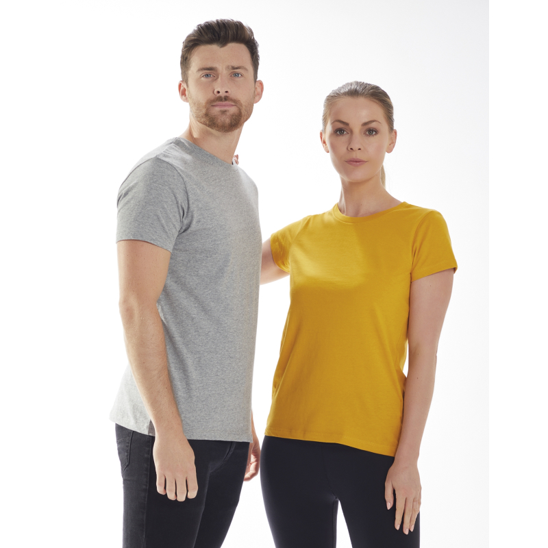 Poids : 160 g/m² | 100% coton BIO | Jersey simple | Col avec bord côte fin et étroit | Ourlet double surpiqûre | Ourlet droit | Coupe moderne | Étiquette détachable dans le cou