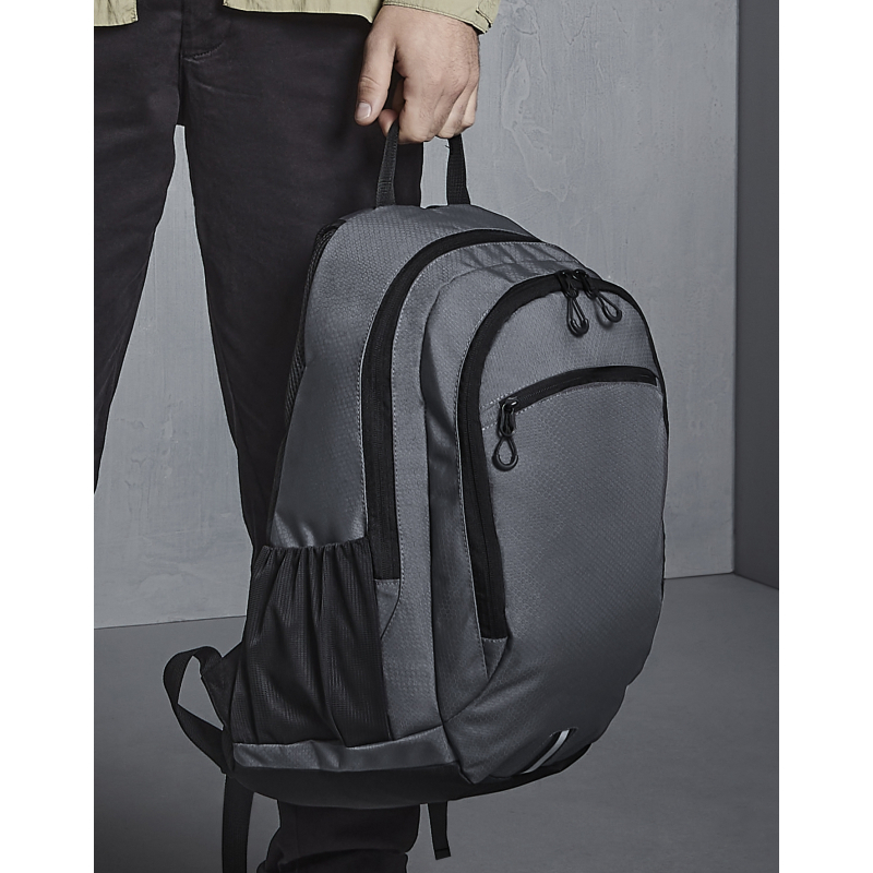 100% polyester 600D Ripstop | poignée de transport | bretelles rembourrées en maille filet et sangle de poitrine | panneau arrière ergonomique rembourré | compartiment rembourré pour ordinateur portable, compatible jusqu`à 15,6 | poche avant avec fermeture à glissière | poche interne en filet, 2 poches en filet, porte bouteille d`eau | accents réfléchissants | étiquette détachable pour faciliter la personnalisation | capacité : 25 litres | dimensions : 33 x 46 x 22 cm | surface maximum pour broderie: anneau tubulaire de 12 | surface maximum pour l`impression : 12 x 20 cm.