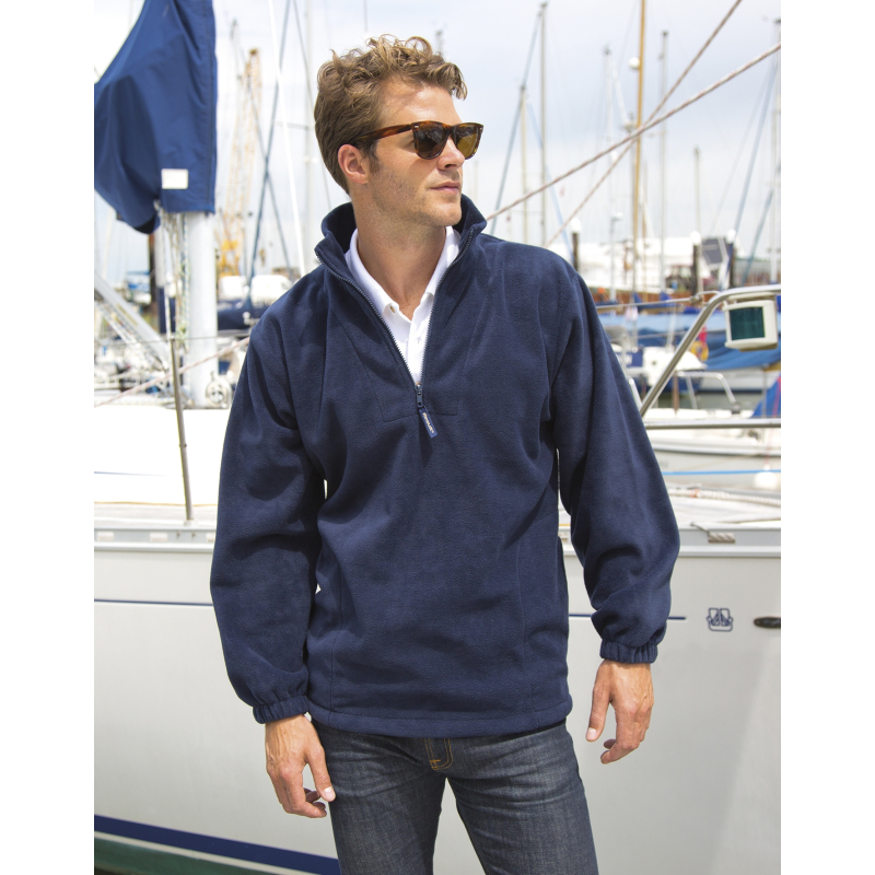 Poids : 330 g/m² | 100% polyester | polaire traité anti-peluche | fermeture à glissière 1/4 | col montant | poches en biais | fentes latérales | poignets élastiqués.