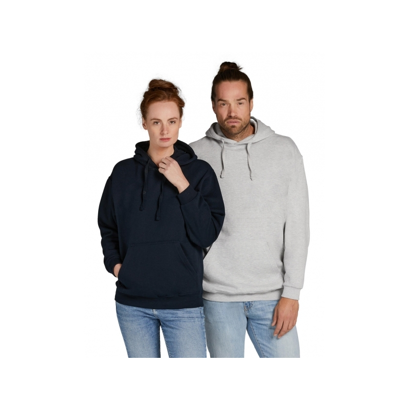 Poids : 280 g/m² | 50% coton, 50% polyester | Heather Grey: 78% coton, 22% polyester | Capuche à 2 panneaux avec doublure dans le même tissu et cordon plat ton sur ton | Bande de propreté au niveau du cou | Manches Set-In | Col, ourlet et poignets côtelés | Coutures latérales | Style sans étiquette, étiquette de taille décentrée dans le cou | Lavable à 60°C