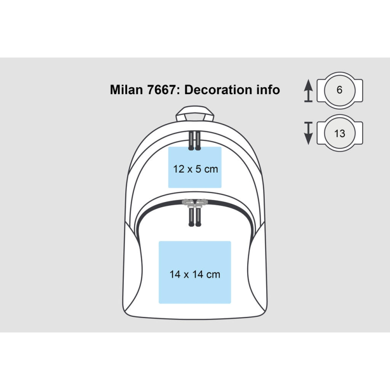 100% Polyester 600D | poignée en toile | bandoulières rembourrées ajustables | large compartiment central | poches avant avec fermeture à glissière | poids: 400 g | capacité: 20 litres | dimensions: 30 x 41 x 17 cm | surface pour la broderie: anneau tubualire de 6, 13 | surface de décoration: 14 x 14 cm