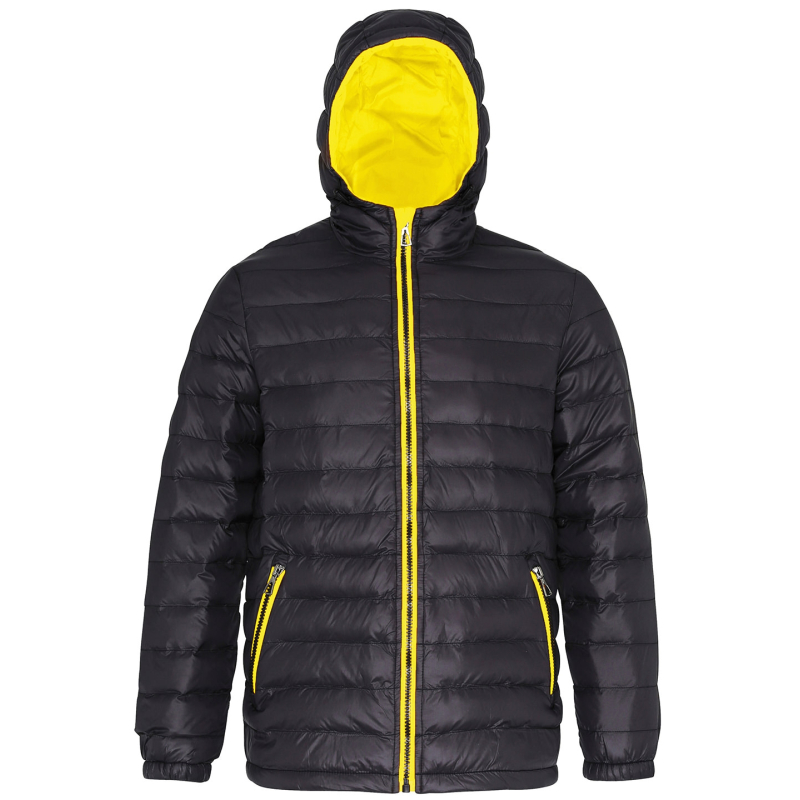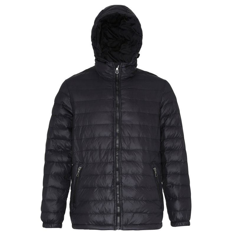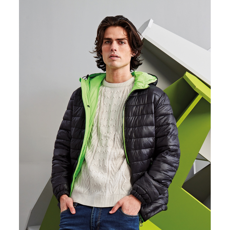 Grammage : Enveloppe en 40 g/m², matelassage 228 g/m², et doublure 50 g/m². Doublure chaude en polyfill. Capuche doublée et ajustable. Composition Extérieur: 100% nylon. Rembourrage: 100% polyester. Doublure: 100% nylon. Zip intégral avec protège-zip. Deux poches intérieures. Deux poches avant zippées. Poignets élastiques. Système facile de réétiquetage.