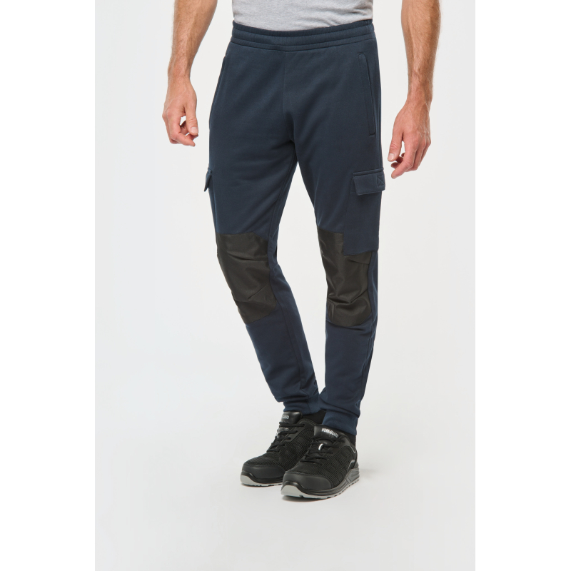 Pantalon molleton cargo écoresponsable homme. Renforts en Cordura® aux genoux. Pièce workwear qui s'inscrit dans une démarche écoresponsable. Confection 3 fils LSF (Low Shrinkage Fleece) : résistance et stabilité au lavage.