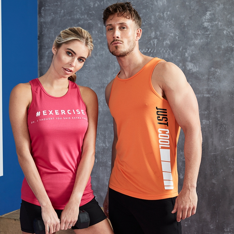 Kühltank AWDis JC007. Schnelle Verdampfungseigenschaften der Atmung. Galon aus dem gleichen Stoff verklebt. Sport fit mit abgerundetem Saum im Rücken.