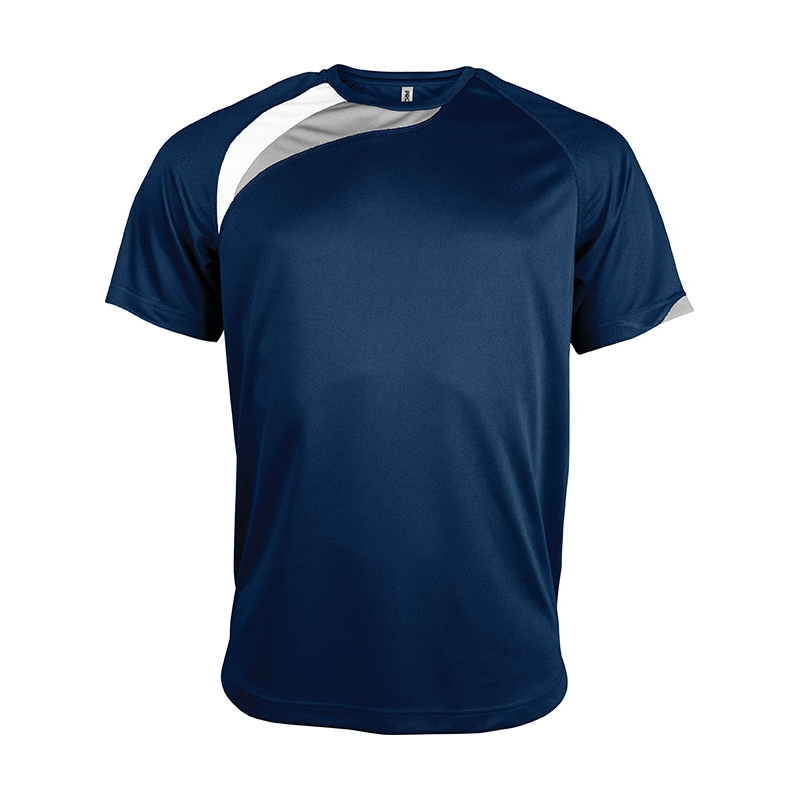T-Shirt Sport kurze Ärmel in 100% Polyester für Männer, Modell mit der Marke Flamme beim Einfügen auf der rechten Schulter. Erhältlich in einem Kindermodell.
