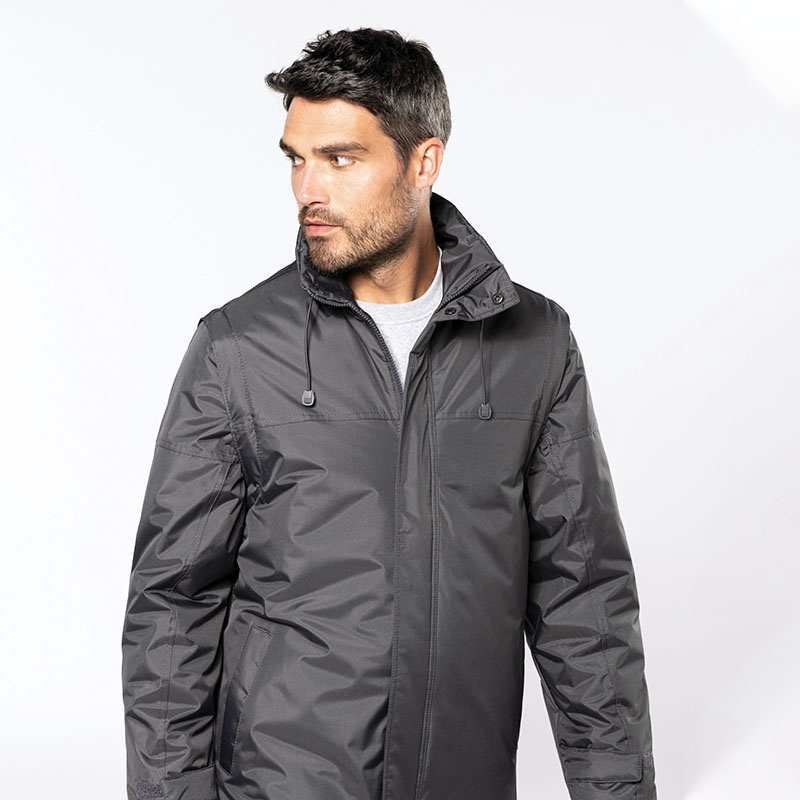 Außen: 100% polyester beschichtung PVC. Zip-Befestigung und Druckknopfklinke. Niedriger Klemmschenkel des selbstklebenden Griffs. Faltbare Kapuze in Kragen, Reißverschluss mit elastischem Kordel. 2 innentaschen + 1 tasche für mobiltelefon. Inside Zip, um Anpassung zu ermöglichen. Körperfutter: 100% polyester und watte 100% polyester. Abnehmbare Ärmel an dem Rumpf mit einem Reißverschluss befestigt. 2 seitentaschen. Untere Klemmschnur mit Stoppern.