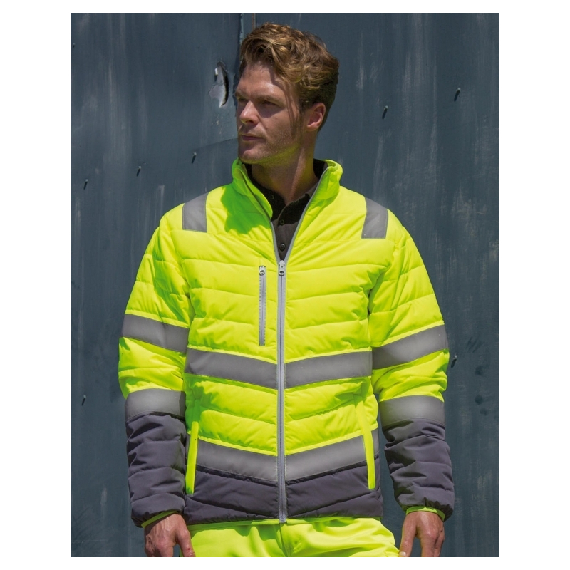 Weich gepolsterte Sicherheitsjacke aus der Marke Result, Referenz R325M. Polyester 75D Steppjacke, hohe Sicht Standard EN20471. Der 75D Polyester macht diese Jacke sehr weich und komfortabel.