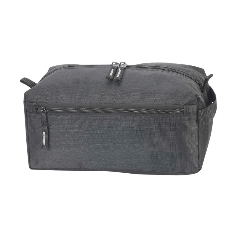 100% Polyester 420D Ristop, einfaches WC-Kit mit Reißverschluss und Griff, 2 Taschen mit Reißverschluss an den Seiten, Schwarz/Schwarz: Reißverschluss in Schwarz, Fassungsvermögen: 4 Liter, Maße: 26 x 11 x 15 cm, Stickfläche: Schlauchring von 5 20 x 5 cm