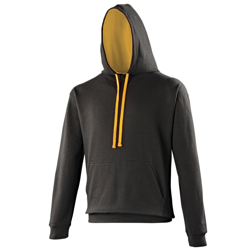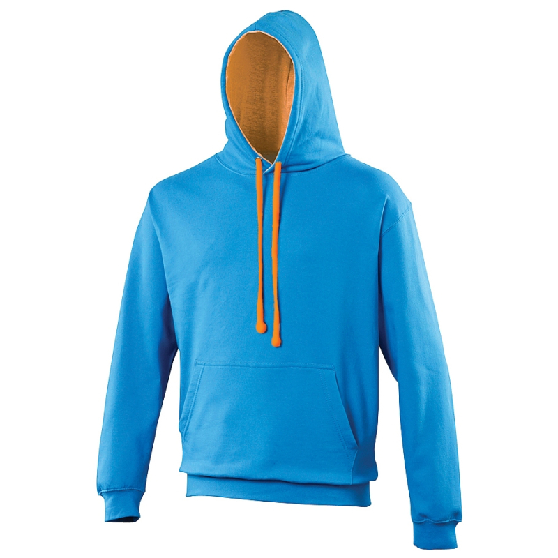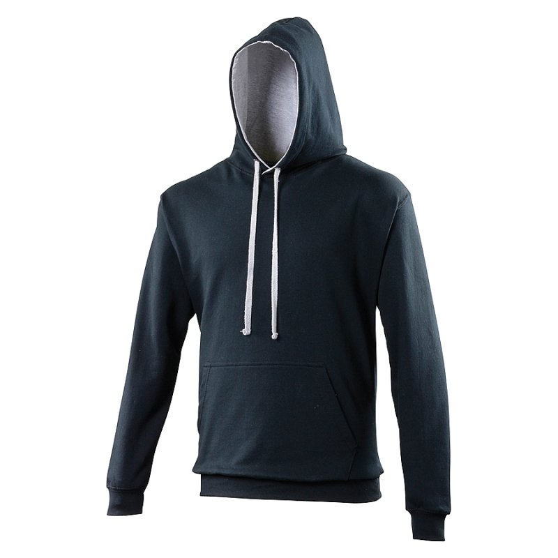Hoodie sweatshirt Varsity AWDis JH003. Weight: 280 g/m2. Composition 80% cotton, 20% polyester. Double-thick fabric hood with contrast lining. Hidden passages to pass the earring threads. Front pocket kangaroo.