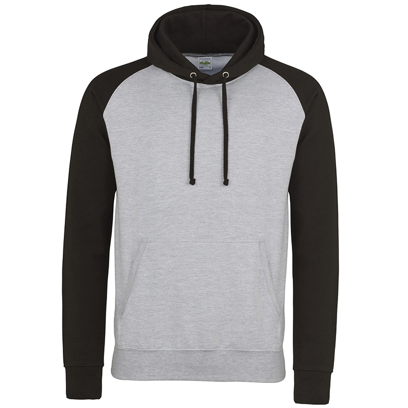 AWDis JH009 baseball hoodie. The two-coloured hoodie with contrasting sleeves and hood for a real US look, a classic for sports teams
