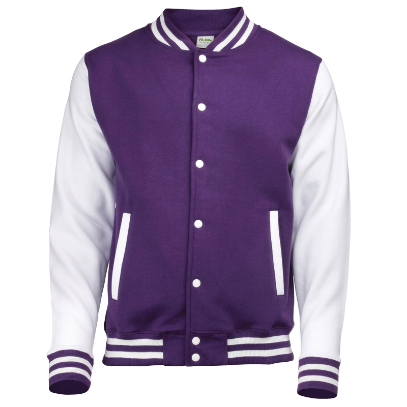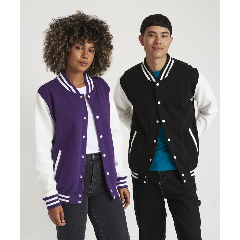 Varsity AWDis jacket JH043. Contrasting sleeves, collar, sleeve edges and ribbed belt with decorative stripes, contrasting snap closure