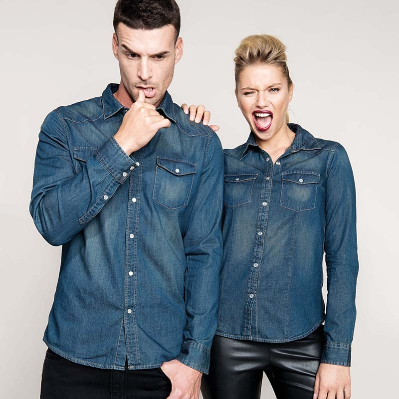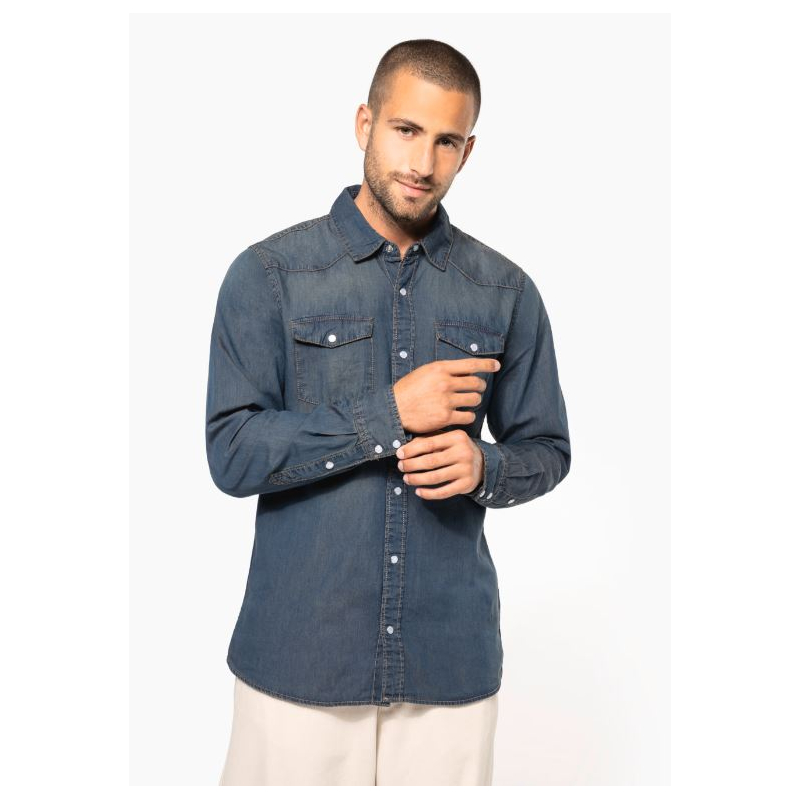 Long sleeves Denim shirt Kariban K519, for a sport/chic look with its mother-of-pearl imitation press buttons.