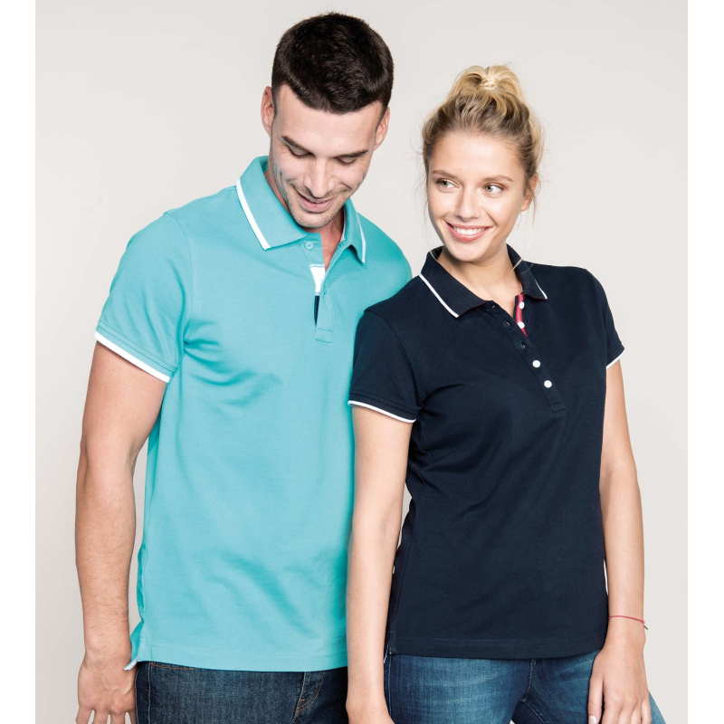 A bicolored woman polo with a contrasting underside of collar, its sole goal being to climb it up and walk without complex on the golf courses.