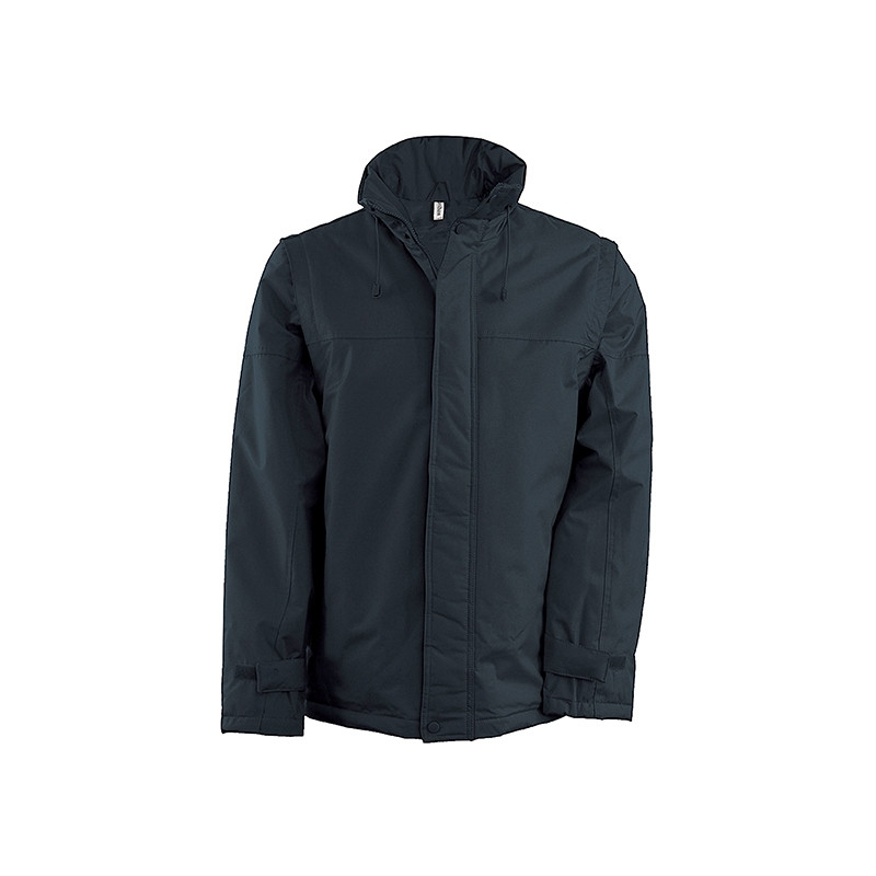 Outside: 100% polyester coating PVC. Zip fastening and push button paw. Low clamping leg of self-adhesive handle. Foldable hood in collar, zip fastening with elastic cord. 2 inner pockets + 1 pocket for mobile phone. Inside Zip to allow customization. Body lining: 100% polyester and wadding 100% polyester. Removable sleeves attached to the torso with a zip. 2 side pockets. Lower clamping cord with stoppers.
