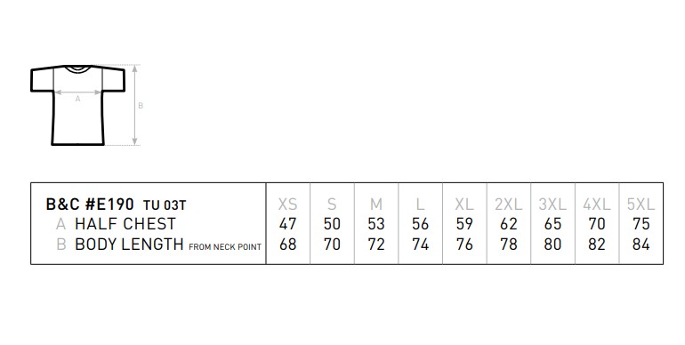 T-shirt #E190 B&C model TU03T is made from 185 g/m² ring-spun pre-shrunk single jersey cotton, offering a soft touch and a very smooth surface for optimal branding. Contemporary tubular cut with discreet rib collar and back neckband for a secure fit. Available in 40 colors including sport grey, black, royal blue or sorbet. Certified Oeko-Tex Standard 100 and a Fair Wear member, this model is ideal for events and promotions, thanks to its durability and printable surface. Appreciated for its value for money and optimal comfort.
