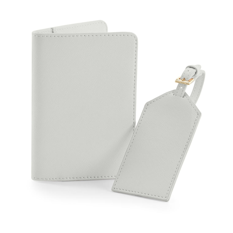 100% polyurethane leather-like, Saffiano fine grain, the set includes an identification label and passport pouch in ultra-gloss gold-plated metal, TearAway label to facilitate rebranding, size in cm: 10.5 x 15.5 passport, 6 x 11.5 label, print area in cm: 8 x 11 passport, 5 x 8 label.