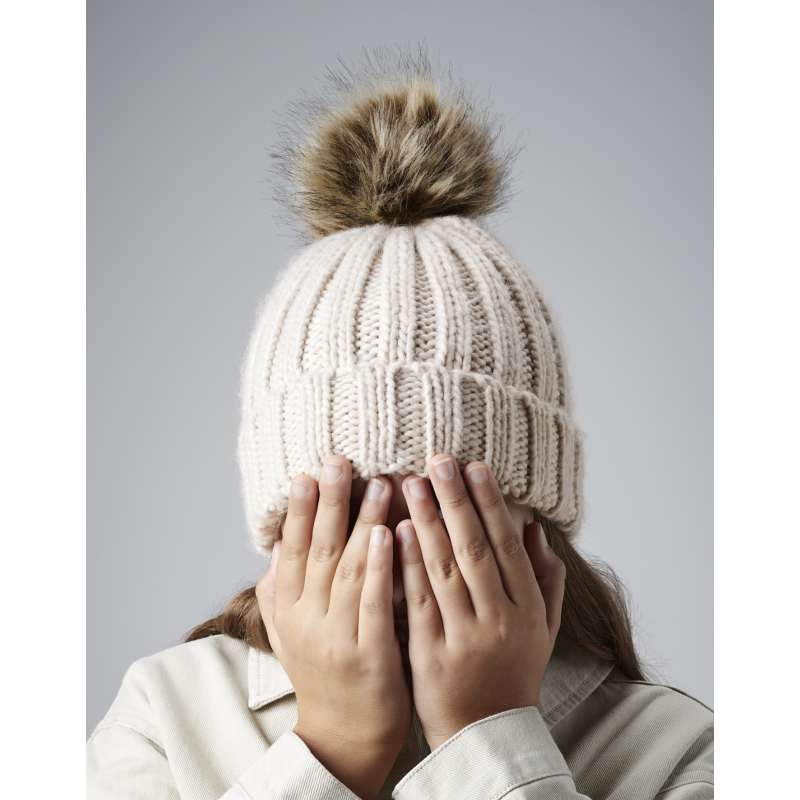 Infant/Junior Fur Pom Pom Chunky Beanie brand Beechfield, reference B412b. Kids hat in big rib with an imitation fur pompom.