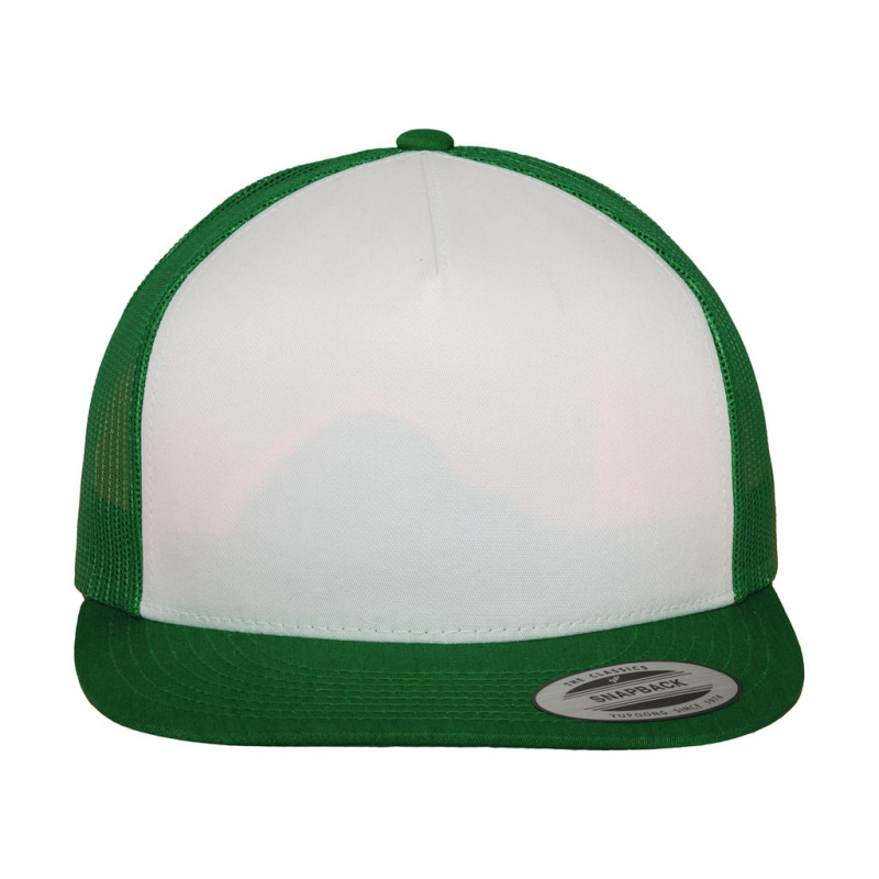 47% cotton, 25% polyester, 28% nylon |5 panels |seamless front panel |buckram |mesh back with hook and loop fastener |flat peak matches the mesh |ideal for printing and embroidery