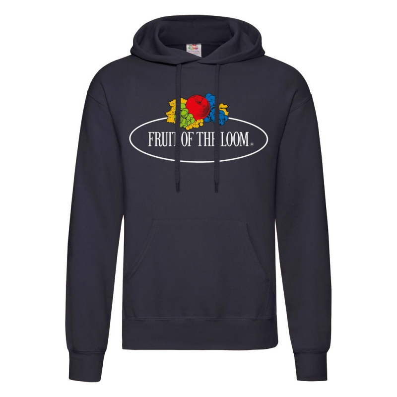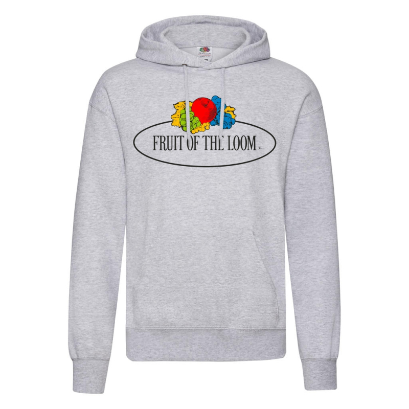 Weight: 280 g/m2 White: 260 g / m2 Fruit of the Loom large print on the front of the hood, lined with flat, plain clamping cord, one-sided sleeves, set-in, ventral pocket, cuffs and hem of the ribbed bottom, Emmanchure with double stitching, tubular manufacture