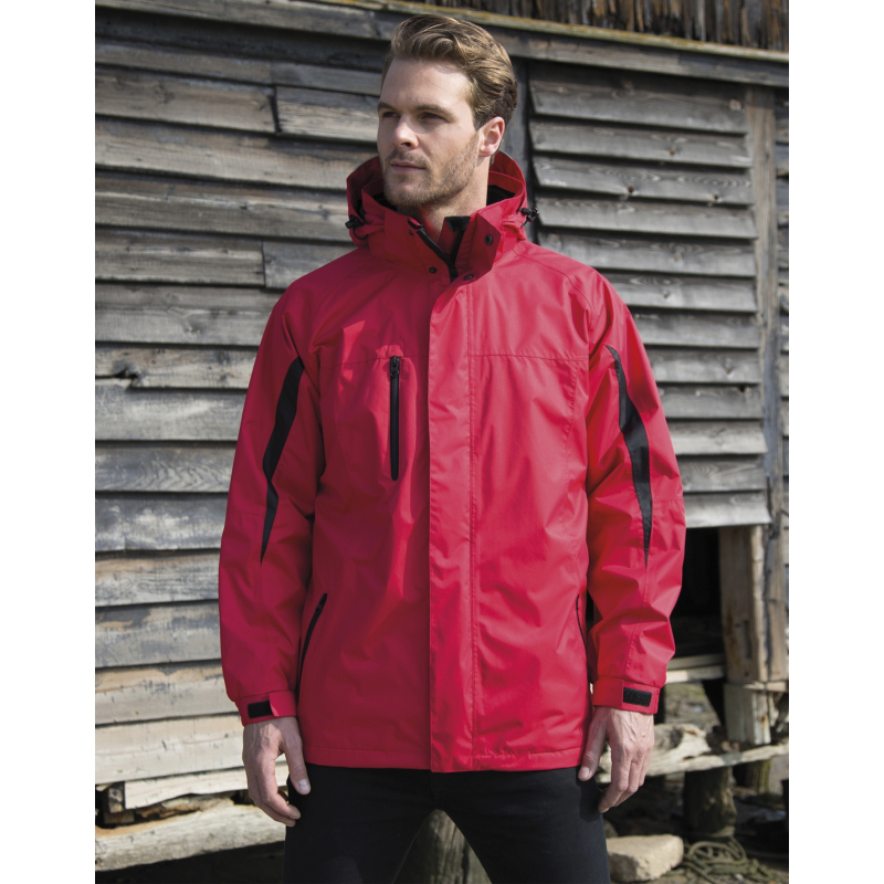 Outer jacket:- 100% polyester ripstop-- thermowelded seams, wind resistant and waterproof 3000 mm, breathable 3000 g/m2 per 24h--Removable lined hood with reflective accent--Cotted knit collar--Full length zip fastening with storm flap and push button--- Chest pocket and front pocket with zipper fastening-- Elasticated cuffs with self-adhesive fastening--Heat rope--softshell inner jacket fastened with zipper fastening-- 280 g/m2---100% 2-layer polyester---Waterproof and windproof--- full zipper fastening---Socks on the side and inside