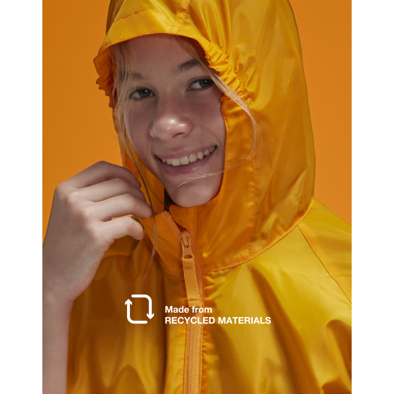 100% polyester (recycled) (RCS-certified) STANDARD 100 (January 2024): Designed for boys and girls (ungroomed), from child to adolescent: Water resistant protection: Elasticated hood in accordance with safety standards: #kids: 2 front pockets: #practical: # elasticated hood in a pocket with zipper and portable at waist with elastic band and loop fastening: #polyvalent: # elasticated cuffs: # insulation
