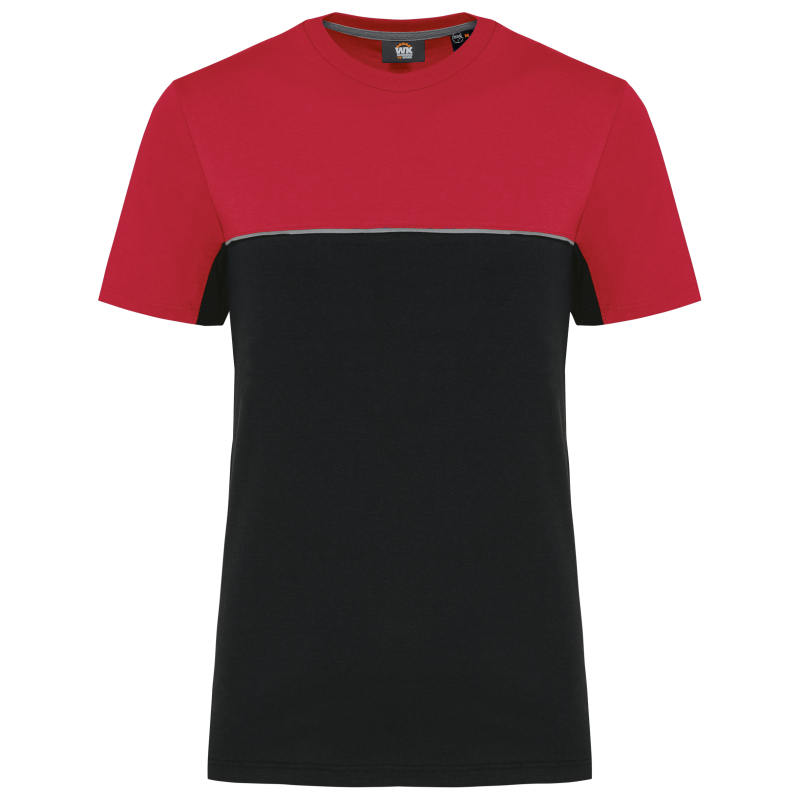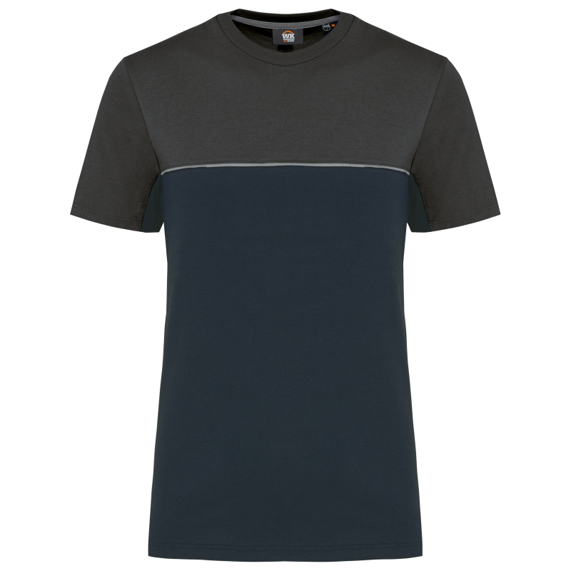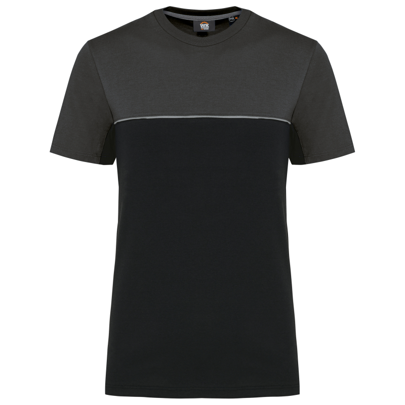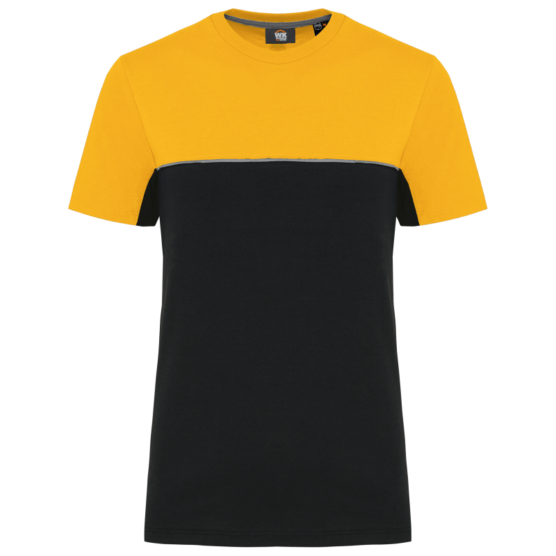 Two-coloured work t-shirt, washable at 60°C. Anti-loosing treatment for better protection of the fabric and increased longevity. T-shirt made from recycled polyester fibres.